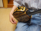 三線は立って弾くこともありますが、慣れていないとなかなか難しいので、座って弾く時の姿勢を説明します。 まず三線を右膝のやや外側に置き、右手首を胴の上に軽く添えます。このとき体と裏面との間に隙間ができるようにしましょう。正座して弾くときも、椅子に座って弾くときも同じです。手首と膝で挟んだとき、左手を離しても三線をおっことさなければOKです。 左手は人差し指を立てて、ギターでいうネック部分の下に添えます。親指との谷間の奥ではなく、人差し指の付け根あたりで持ちましょう。この場所が基本となるポジションです。背筋を伸ばして左手を肩の位置まで上げます。 |