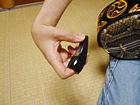 人によっては、ギターのピックや自分の爪などで弾く人もいますが、まずは爪(ばち)を持って弾きましょう。バチは人差し指を穴に入れ、人差し指で爪の先端部分を抑えます。弾くときは感覚を爪全体ではなく、爪の先数ミリに意識します。弦を下に弾くわけですが、爪を立てて弾くのではなく、次の弦で受け止めるつもりで弾きます。弦を弾く位置は、真ん中より少し棹寄りの場所です。 |