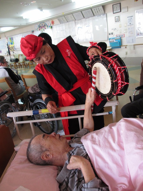 あら不思議寝たきりのおじいさんが締め太鼓をタタイテくれました。施設の人もびっくりです。良かったですね。